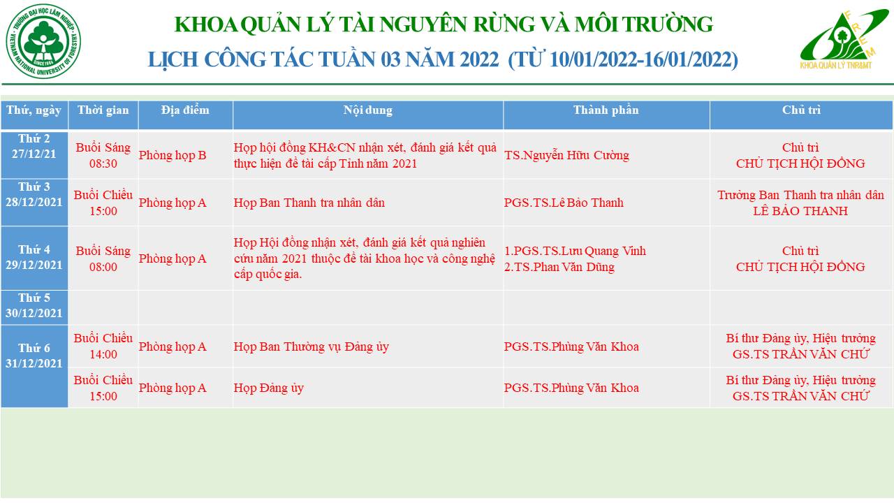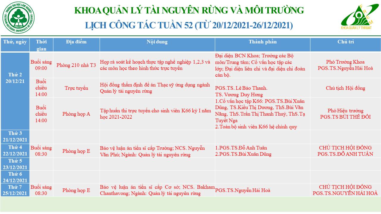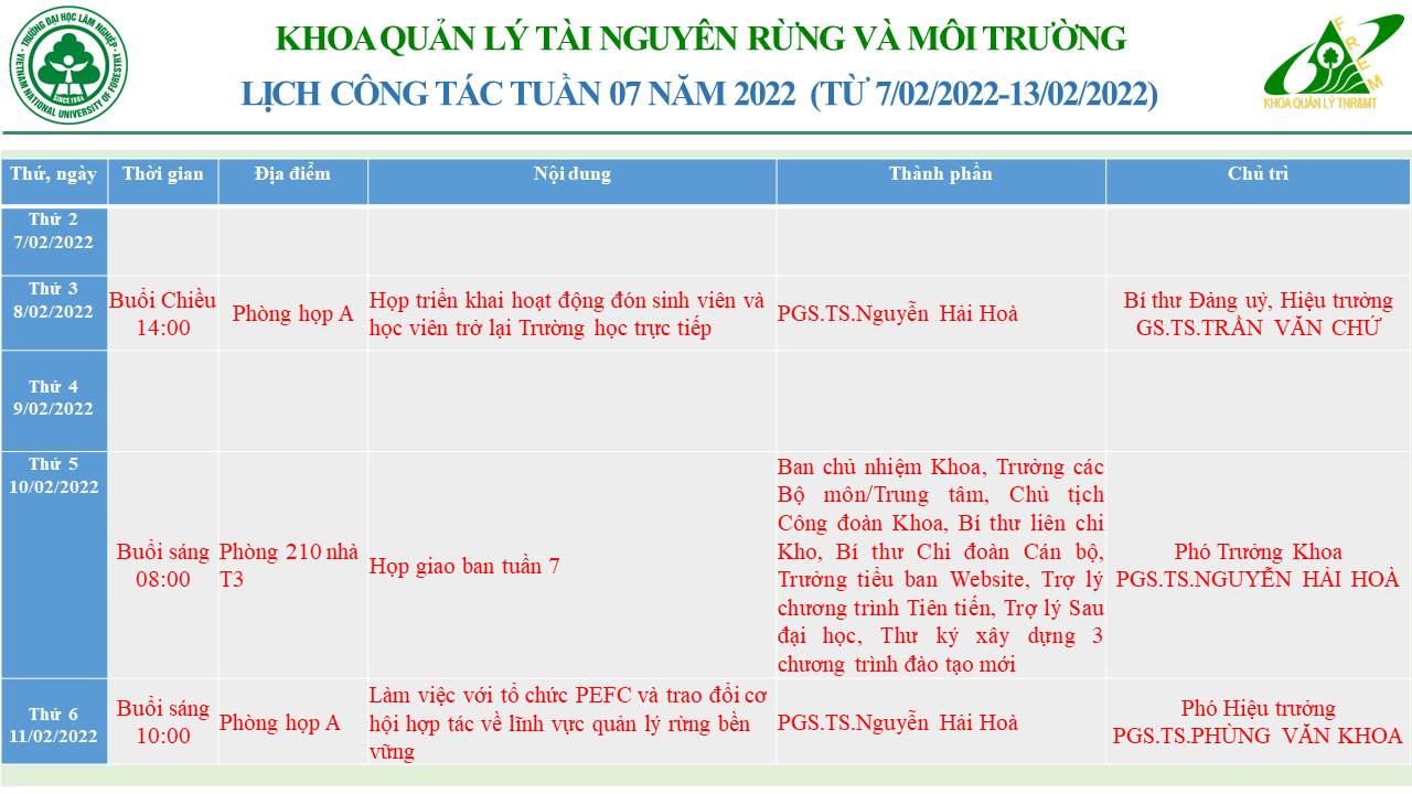Dưới đây là bảng phân công công việc của Trợ lý Khoa Quản lý Tài nguyên Rừng và Môi trường. Bảng được xây dựng nhằm xác định rõ nhiệm vụ, trách nhiệm của từng cá nhân, bảo đảm công tác của Khoa được...