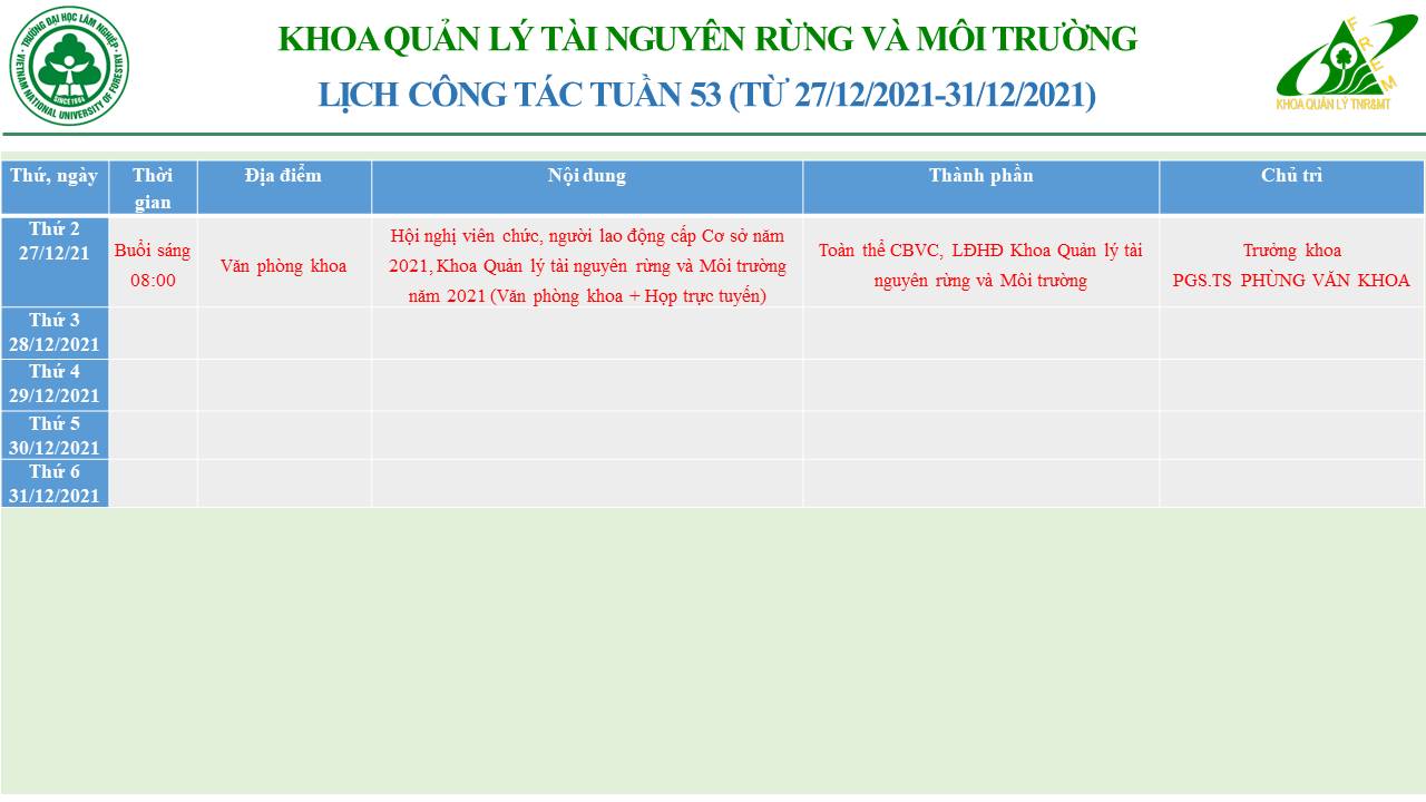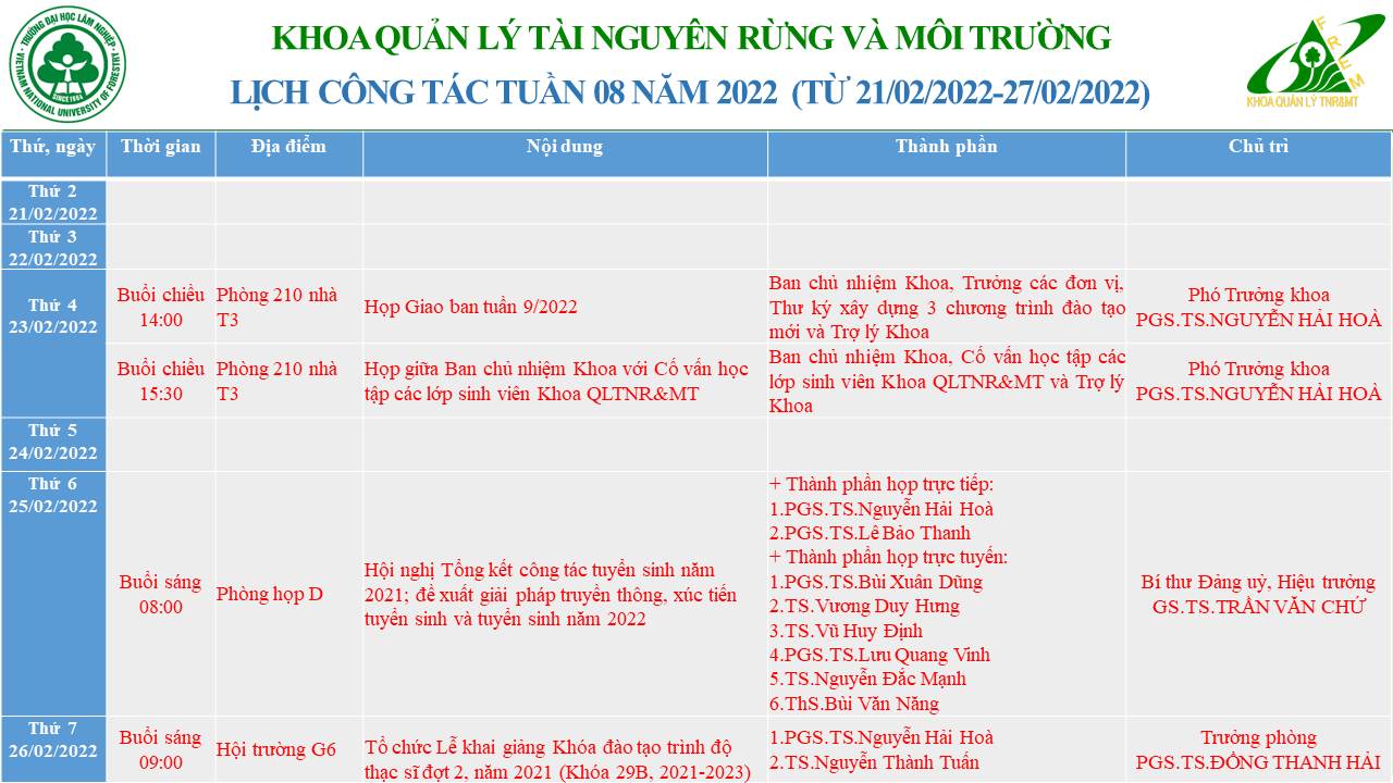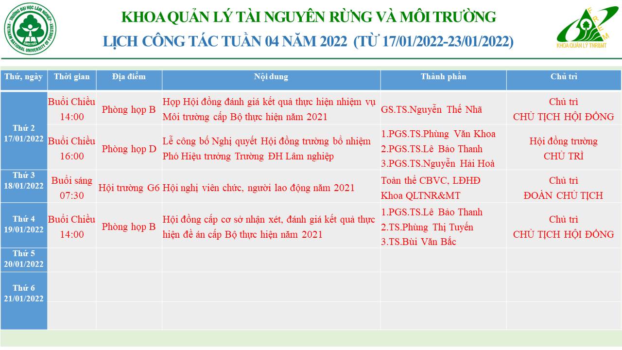 Dưới đây là bảng phân công công việc của Trợ lý Khoa Quản lý Tài nguyên Rừng và Môi trường. Bảng được xây dựng nhằm xác định rõ nhiệm vụ, trách nhiệm của từng cá nhân, bảo đảm công tác của Khoa được...