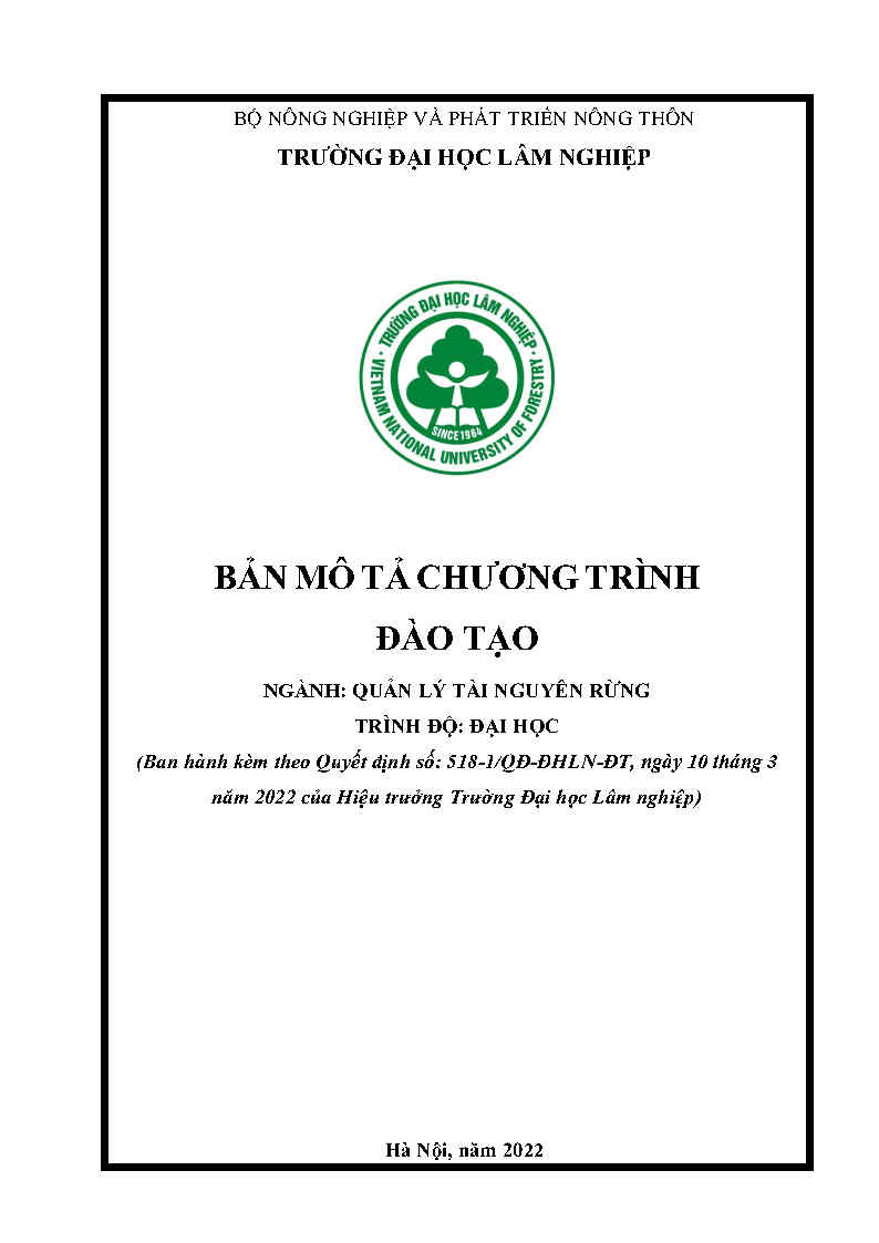 Đọc tiếpBản mô tả chương trình đào tạo ngành Quản lý Tài nguyên rừng trình độ đại học quy định mục tiêu đào tạo, chuẩn đầu ra, khối lượng kiến thức, cấu trúc chương trình và phương thức tổ chức giảng dạy. Văn bản được ban hành theo Quyết định số 518-1/QĐ-ĐHLN-ĐT ngày 10/3/2022, làm cơ sở triển khai đào tạo và đảm bảo chất lượng chương trình tại Trường Đại học Lâm nghiệp.