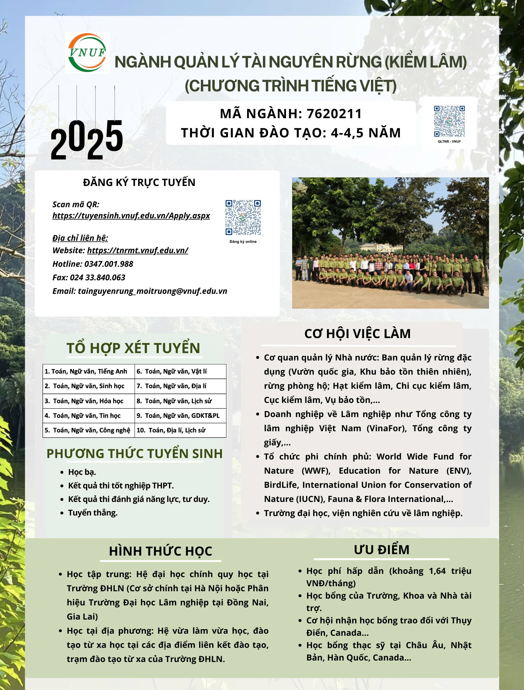 Đọc tiếpTrường Đại học Lâm nghiệp tuyển sinh các ngành: Quản lý tài nguyên rừng (Kiểm lâm), Quản lý tài nguyên thiên nhiên (đào tạo bằng tiếng Anh), Quản lý tài nguyên rừng và môi trường, và Du lịch sinh thái. Các ngành học trang bị kiến thức và kỹ năng về quản lý – bảo tồn – phát triển bền vững tài nguyên rừng, môi trường và du lịch sinh thái, giúp sinh viên trở thành kỹ sư, chuyên viên, nhà quản lý hoặc chuyên gia trong lĩnh vực tài nguyên và môi trường, làm việc tại cơ quan nhà nước, vườn quốc gia, khu bảo tồn, doanh nghiệp, tổ chức quốc tế và dự án phát triển.
