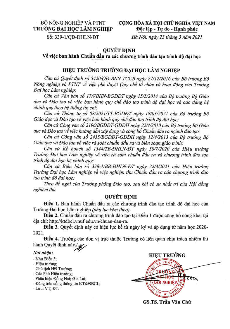 Quyết định số 339-1/QĐ-ĐHLN-ĐT ngày 23/3/2021 của Trường Đại học Lâm nghiệp...